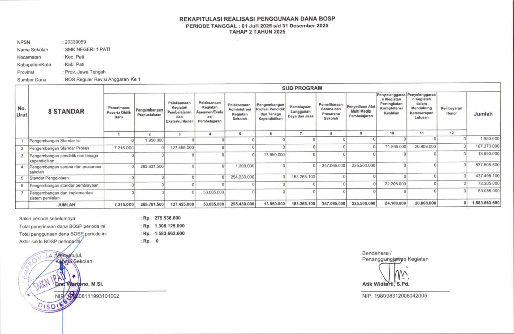 Rekapitulasi Realisasi Penggunaan Dana BOSP Tahap 2 Tahun 2025